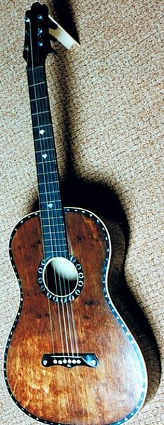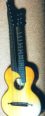 Im Pariser Musikmuseum und im Museum der Musikinstrumentenhochburg Mirecourt habe ich zwei Instrumente gesehen, die eine fast identische Form aufweisen. Im Unterschied dazu sind aber beide nach dem Gelas - System der doppelten Resonanzdecke gebaut. Sie werden beide als "guitare hawaiienne" bezeichnet. Ich vermute, dass mein Instrument eine Version mit normaler Schalldecke ist, das als Nachbau dieser Vorlagen wohl ebenfalls in Frankreich gebaut wurde.