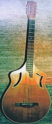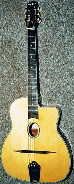 Django Reinhardt machte den Jazz, in der Ausprägung wie ihn die Zigeuner spielten, populär. Er verwendete eine Gitarre im nebenstehenden Stil. Der Korpus und die Mensur waren relativ groß, mit einem typischen Cutaway und einem ovalen Schallloch. Es hat sich als Hauptinstrument des Gypsy Jazz zusammen mit der Geige durchgesetzt. [798]