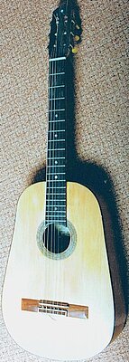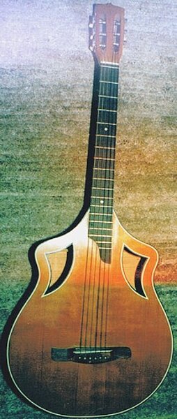 Die links abgebildete Gitarre hat eine sehr unübliche Form: die Seiten verjüngen sich vom breitesten Teil aus zum Hals zu in konischer Form und weisen nicht die für Gitarren sonst typischen Einbuchtungen auf.