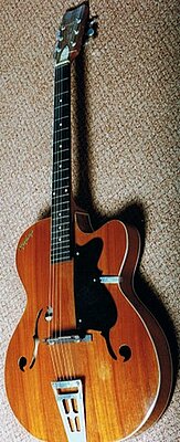Die rechte Gitarre ist ein Epiphone-Nachbau aus Indien. Die Bauform ist angelehnt an die legendäre L-5 Gitarre von Gibson. Es besitzt F-Schalllöcher, einen verstellbaren Steg und eine von der Archtop-Decke abgehobene Schlagplatte, ähnlich auch wie die Mandolininstrumente im Bluegrass. Der Korpus ist ziemlich flach. Diese Bauform wurde überwiegend von Jazzgitarristen vieler Stilrichtungen bevorzugt.