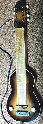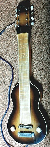 Die erste Steel-guitar wurde 1932 in Amerika gebaut. Die Bezeichnung kommt von der Spielweise her: das mit Stahlsaiten bezogene Instrument wird auf den Schoß (lap) gelegt. Meist wird sie im Slide-Stil gespielt. Sie wird dabei nicht mit den Fingern der linken Hand abgegriffen, sondern die Saiten werden mit einem Metallstäbchen oder -röhrchen oder mit einem Flaschenhals, der über einen Finger gestülpt wird, im Glissando gespielt. Es entsteht dabei der singende Ton, der hauptsächlich in der typischen Hawaii - beziehungsweise in der amerkanischen Countrymusik verlangt wird. Die Lapsteel - Gitarre rechts wird deswegen manchmal auch als Hawaiigitarre bezeichnet. Diese wird über ein elektrisches System verstärkt, es gibt aber auch rein akustische Instrumente.