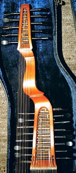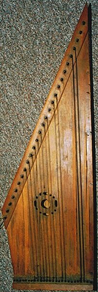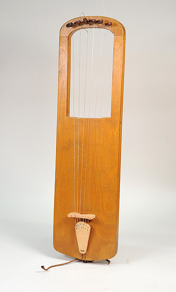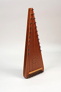 Dieses interessante Instrument wurde von dem Verkäufer in England als Lyraharfe bezeichnet. Über das Alter ist nichts bekannt, es scheint nach der Bauweise aber schon recht alt zu sein. Es handelt sich um eine Leierform mit einem trapezförmigen Kasten als Resonator, in dessen Decke drei Schallöffnungen ausgeschnitten sind. Aus dem Korpus treten zwei Jocharme aus, die in der Mitte durch ein festes Querholz stabilisiert werden. Die 13 Saiten sind am unteren Ende des Korpus an einem schmalen Querriegel befestigt. Sie verlaufen über zwei Stege, die in geringem Abstand parallel auf der Decke aufgesetzt sind. Am Ende der seitlichen Jocharme befindet sich ein Joch, an dem die Saiten befestigt sind. Dieser Saitenhalter ist beweglich und kann mit Hilfe eines Knebels aus Metall gedreht werden. Auf diese Weise lässt sich die Tonhöhe beliebig verändern.