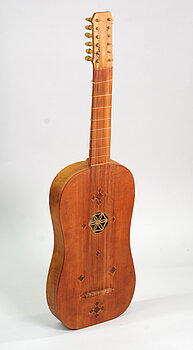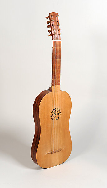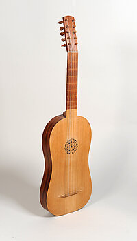 Das nebenstehende Instrument, eine Gitarrenlaute, hat einen gewölbten, aus mehreren Spänen zusammengesetzten Korpus. Die Saiten sind an einem verzierten Querriegel befestigtund enden in einem leicht zurückgeneigten Wirbelkasten mit Gitarrenmechanik. Die Bünde des Griffbretts sind leicht gekehlt und setzen sich als aufgeleimte Stäbe auf der Decke fort. Die Rosette ist aus der Fichtendecke fein herausgearbeitet.
