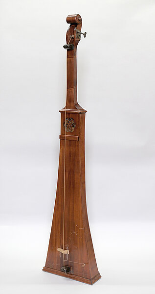 Diese Drehleier (Radleier) besitzt einen gitarrenförmigen Resonanzkörper, der ebenso wie die Rad- und Tangentenabdeckung mit Intarsien schön verziert ist. Sie besitzt zwei Melodiesaiten in c, einen kleinen Bordun in f, zwei große Bordune in c und f sowie eine Schnarrsaite in c. Die Wirbelplatte ist mit einem geschnitzten Kopf verziert.