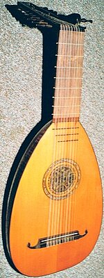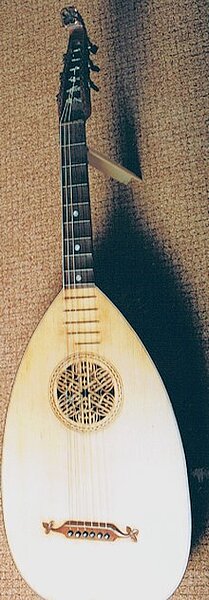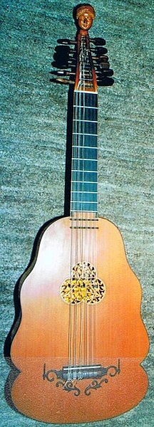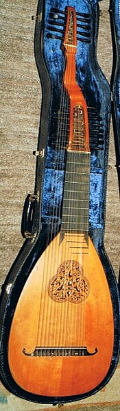 Das Instrument aus meiner Sammlung wurde beim Early Music Shop gebaut. Es basiert auf einem Original von Beuchenberg und wurde unter Mitwirkung des Lautenisten David Parsons hergestellt. Der Korpus besteht aus hellen und dunklen Palisanderstreifen, das Griffbrett ist ebenfalls aus Palisander. Die Decke ist massive Fichte, die drei Rosetten handgeschnitzt. Das Instrument hat sechs einzelne Griffsaiten und acht frei schwingende Bordune.