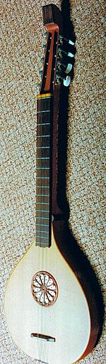 Diese Pandora wurde laut Verkäufer vom Lautenbauer Estruch in Barcelona gebaut. Erfinder dieser Lautenart war der Engländer John Rose um das Jahr 1560. Sie verfügt über einen festen Querriegel, sechs doppelchörige Stahlseiten und bis zu 15 Bünde. Signifikant ist der mehrfach ausgebuchtete Resonanzkörper, der Wirbelkasten ist oft mit einem geschnitzten Frauenkopf verziert. Sie fand wohl überwiegend im Broken Consort Englands Verwendung, das aus Violine, Viola da Gamba, Flöte, Cister, Laute und Pandora zusammengesetzt war. Sie fungierte hier als Bassinstrument, gewissermaßen als Gegenstück zu der hell klingenden Cister. Es wurden aber auch Solostücke für dieses Instrument geschrieben.