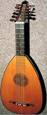 Die Darmsaiten wurden an einem Querriegel befestigt und verliefen über einem meist geraden oder leicht gewölbten Griffbrett zu einem Wirbelkasten, welcher in fast rechtem Winkel nach hinten abknickt (Knickhalslaute). Die Saiten waren bis auf den höchsten Chor (Chanterelle) doppelchörig angeordnet. Die Zahl der Chöre betrug zunächst sechs, wurde aber später auf bis zu elf und 13 erweitert. Die Mensur lag zwischen 60 und 70 cm. Der Klang der Saiten ist heller als bei der Gitarre, weil die höheren Teiltöne stärker hervortreten, dafür aber nasaler und weniger farbig.