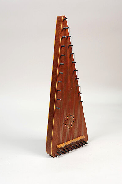 Eine abgewandelte Dreiecksform zeigt dieser Psalter. Zur Erweiterung des Klangspektrums ist die eine Seite verlängert, die Saiten verlaufen also teilweise außerhalb des Klangkörpers, auch hier erfolgt die Übertragung der Saitenschwingung durch einen aufgesetzten Steg. Die Maße des Instruments sind L = 685, B = 210, H = 25, die Mensur beträgt 595 bis 210, es hat 15 Stahlsaiten. Auf Grund der Bauweise dürfte es sich auch um einen Streichpsalter handeln.