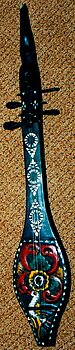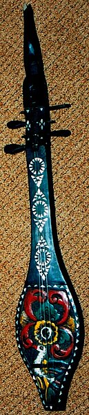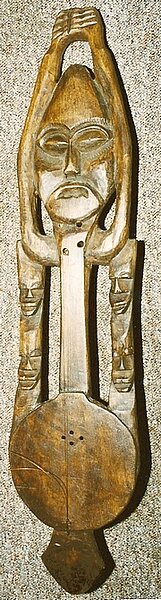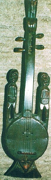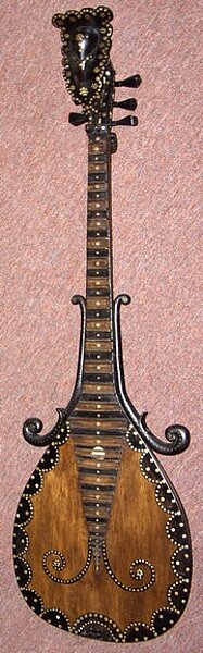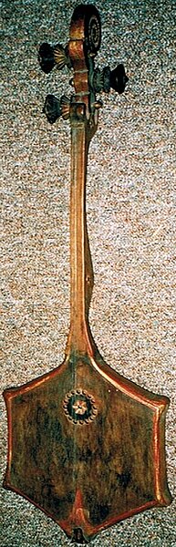 Die nebenstehende alte Volkslaute ist aus einem Stück herausgearbeitet. Der Resonator wird durch eine aufgenagelte Holzdecke abgeschlossen. In diese ist ein kleines, rundes Schallloch eingebohrt. Die sieben Saiten sind unterständig an der Seite des Schallkörpers befestigt und verlaufen über einen wahrscheinlich nicht originalen Steg über den Hals des Instruments, welcher keine Bünde besitzt. Durch eine Öffnung treten die Saiten in den Wirbelkasten ein, wo sie an seitständigen Wirbeln gespannt werden können. Der Kopf ist markant und aufwändig gestaltet. Er zeigt eine furchterregende menschliche Figur mit weit aufgerissenen Augen und gefletschten Zähnen, die eine kleinere Gestalt umfasst.