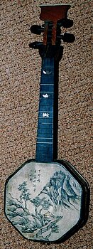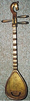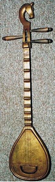 Über die hier abgebildete, goldbronzierte Laute gibt es kaum Informationen. Der angeschnitzte Pferdekopf lässt auf eine Herkunft aus dem mongolisch-mandschurischen Raum schließen. Die stark hervortretenden Bünde auf dem Griffbrett zeigen chinesischen Einfluss, ebenso der relativ flache Korpus und die Saitenhalterung auf der hölzernen Decke, wie z.B. beim yüetqin.