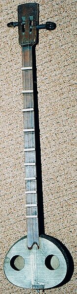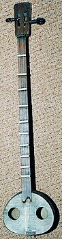 Dieses zweisaitige Instrument besitzt einen Korpus aus Kokosnuss mit einer Holzdecke, in die zwei relativ große Schallöffnungen eingearbeitet sind. Auf dem langen Hals sitzen zehn hohe Bünde aus Holz, wie sie bei chinesischen Instrumenten oft anzutreffen sind. Handelt es sich um eine Yehu ? (siehe Kapitel Ostasien)