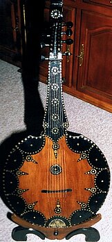 Das linke Instrument ist aus einem sehr schweren Tropenholz gefertigt, Korpus und Hals sind aus einem Stück gearbeitet und dotpaintartig verziert. Es besitzt acht Saiten, die über einen auf der Holzdecke aufgesetzten Steg und über den bundlosen Hals verlaufen und in seitenständigen Wirbeln befestigt sind. Der Kopf ist sehr aufwendig gestaltet.