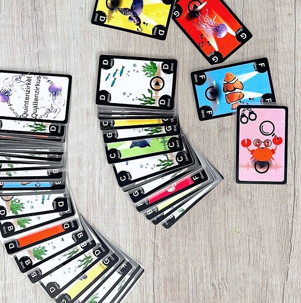 Quintenzirkel-Quallenzirkus ist auf Vorlage des Spiels Mogel Motte (Verlag Drei Magier) entstanden. Bei diesem Spiel ist Schummeln erlaubt, doch ganz nebenbei können die Schüler*innen auch die ersten Tonarten des Quintenzirkels und ihre Beziehung zueinander erlernen. Spaß und Lernen findet hier gleichzeitig statt, einfach mal ausprobieren!