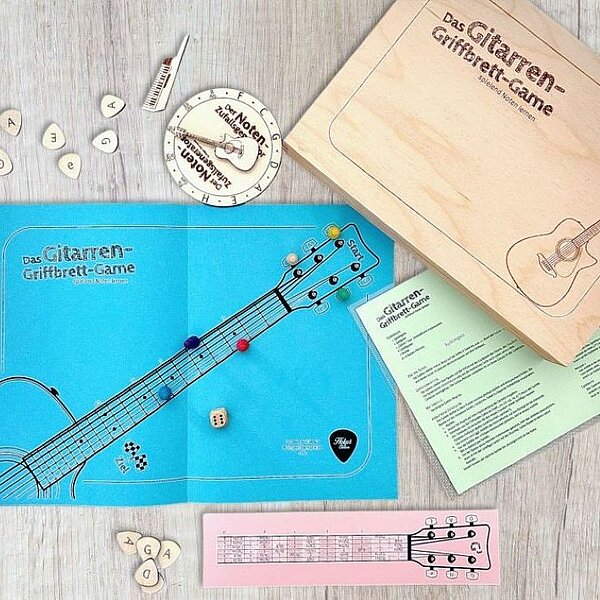 Das Gitarren-Griffbrett-Game ist ein Brettspiel für alle angehenden und erfahrenen Gitarrist*innen, die sich so richtig gut auf dem Griffbrett auskennen wollen. Auf dem Weg von Saite zu Saite erlernen bis zu sechs Spieler*innen von jung bis alt mit Glück und Verstand dabei en passant die Noten auf dem Griffbrett. So macht Noten lernen Spaß!