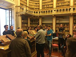 Mit Mantua, Ferrara und Florenz standen drei Städte auf dem Plan, in denen jeweils eine große Familie weit mehr als einen Fußabdruck hinterließ: Die Familien Gonzaga, d’Este und Medici gestalteten über Jahrhunderte maßgeblich das kulturelle Leben in den jeweiligen Provinzen. Bei Führungen durch die drei Städte und deren Paläste offenbarte sich für die Exkursionsteilnehmer die unglaubliche Rolle von Repräsentation in der Agenda der Familien, zu deren Symptomen die Vielzahl und bauliche Gestaltung der Prachtbauten wie dem „Palast der Diamanten“ in Ferrara gehören. Aus musikalischer Perspektive zeigt sich diese Mentalität im „Einkaufen“ ganz großer Namen: Monteverdi erhielt die Einladung nach Mantua, Josquin nach Ferrara, wo er dem Herzog die Hexachord-Messe Ercole Dux Ferrariae schrieb, und Isaac wurde für eine Organistenstelle in Florenz gewonnen. In Mantua bestaunte die Würzburger Gruppe den Palazzo del Te, in dem man Monteverdis Orfeo an den Wänden zu begegnen scheint, und in Florenz den Palazzo Pitti, wo mit La pellegrina anlässlich der Hochzeit von Ferdinando I. de’ Medici mit Christine von Lothringen 1589 die wohl aufwendigste Intermedien-Produnktion der Geschichte stattfand – die Aufzählung könnte man noch lange fortführen. Dementsprechend stellten sich der Besuch der Uffizien, die Stadtführung durch Florenz und der Besuch der Biblioteca Medicea Laurenziana als kaum gänzlich zu fassende Referenznennung heraus; die Namen Michelangelo, Boccaccio, Galileo und Landini fielen im Vorbeigehen. Nachdem einige Musikwissenschaftler am ersten Abend in Ferrara schon beim Anblick verschiedener Abbildungen von Choralhandschriften auf der Baustellenverdeckung (!) am Dom beinahe das Abendessen vergessen hatten, waren diese Begegnungen eine atemberaubende Steigerung.