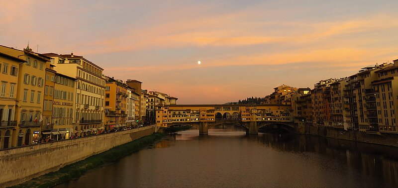 Trotz der großen Menge an anregenden Eindrücken war am Ende der Zeit in der Toskana doch klar, dass man dort gerade mal einen kleinen Teil des musikgeschichtlich Relevanten absolviert hatte. Es bleibt also zu hoffen, dass einmal wieder eine Studienreise gen Süden führt. Florenz tat am letzten Abend jedenfalls sein Bestes, um sich in farbenfroher Erinnerung zu erhalten und verabschiedete sich mit einem schon beinahe kitschigen Sonnenuntergang bei gleichzeitigem Mondaufgang über dem Ponte vecchio.