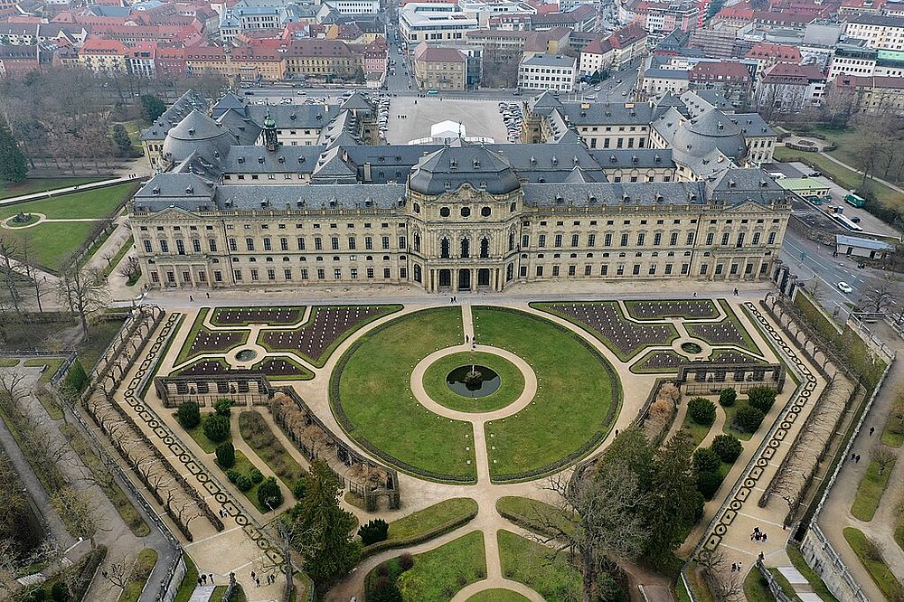 Wir befinden uns im Hofgarten der Residenz, einem der zentralen Austragungsorte des deutschlandweit ältesten Mozartfestes. Hier in der Residenz, wurde bereits im Jahr 1921 mit der „Würzburger Musik- und Theaterwoche“ der Beginn des Mozartfests eingeläutet, welches während des Zweiten Weltkrieges zwar pausieren musste, aber 1951 wiederaufgenommen wurde. Seitdem findet es jedes Jahr im Frühsommer statt und setzt sich, während der vierwöchigen Festperiode, aus stets neuen Perspektiven mit dem Werk und Wirken Mozarts auseinander. Pro Saison zieht es aktuell ca. 26.000 Besucher*innen an und führt so zahlreiche Musikliebhaber*innen und Mozartbegeisterte nach Würzburg.
