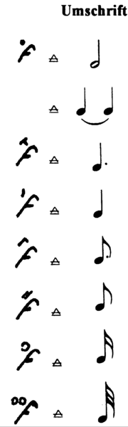 In der nebenstehenden Transkriptionstafel sind die Zeichen für die Tondauern über dem Zeichen für den Ton rast (g') notiert, um die Funktionsweise der beiden Notationsebenen zu veranschaulichen.