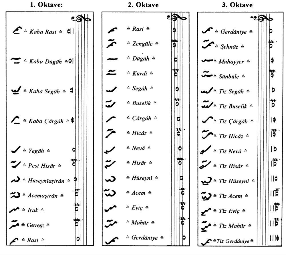 Die hamparsum-notas verfügt über zwei Notationsebenen, deren erste die Tonhöhen festhält, während in der zweiten, darüberliegenden, die jeweiligen Tondauern angegeben sind. Das Notationssystem umfaßt einen Ambitus von drei Oktaven; der tiefste notierbare Ton ist, Suphi Ezgi zufolge, dessen Transkriptionsschlüssel der Ausgangspunkt für die folgenden Betrachtungen sein soll, kaba rast (g), der höchste tîz gerdâniye (g'''). Eine Oktave ist in sieben Tonstufen geteilt, die durch sieben Basiszeichen dargestellt sind. Durch leichte Veränderungen der jeweiligen Basiszeichen sind die korrespondierenden Oktavlagen notierbar; Alterierungen werden durch eine dem Tonzeichen beigegebene Tilde gekennzeichnet, die den Ton sowohl erhöhen als auch erniedrigen kann. Unter Verwendung dieses übersichtlichen Verfahrens sind prinzipiell alle in der türkischen Kunstmusik vorkommenden Tonhöhen notierbar, jedoch führt die Tatsache, daß zur Differenzierung der verschiedenen Mikrointervalle nur ein Versetzungszeichen zur Verfügung steht, zwangsläufig zur Zeichenambivalenz bei der Notierung einzelner Tonstufen. Es ist folglich jeder Transkription eine Notierung des zugrundeliegenden makam, der üblicherweise in der Betitelung eines Notats neben dem verwendeten usul genannt ist, voranzustellen, um so die Intervallverhältnisse zu klären, die bei einer Umschrift zu berücksichtigen sind. Bei Modulationen in einen anderen makam sind die entsprechenden Regeln zu beachten, wie sie etwa Rauf Yekta in den seinen makam-Beschreibungen beigegebenen kurzen Beispielen zeigt.