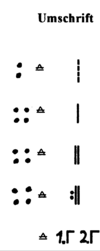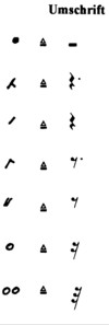 In der nebenstehenden Transkriptionstafel sind die Zeichen für die Tondauern über dem Zeichen für den Ton rast (g') notiert, um die Funktionsweise der beiden Notationsebenen zu veranschaulichen.