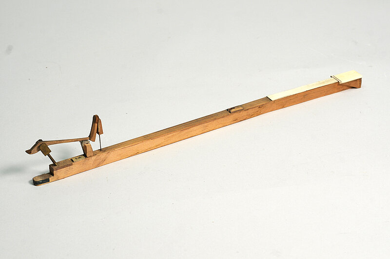 Tastenführung: Kanzellenführung, gebildet durch Ahornplättchen. eingelassen in zwei Leisten aus