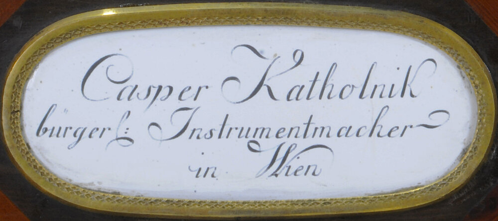 Wien, nach 1802. – Signatur: Emailliertes ovales Blechschild mit vergoldetem Messingrahmen auf dem Vorsatzbrett. Schwarze Inschrift: "Casper Katholnik | bürgerl: Instrumentmacher | in Wien."