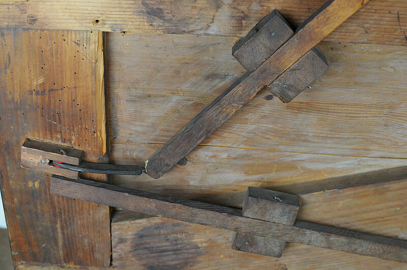 Stimmstock aus Hartholz. 2-teilig (s. Wirbelanordnung). Stimmstockauflage aus schwarz geb. Rotbuche, am Diskantende ebenfalls mit aus schwarz geb. Lindefurnier ausgeschnittenem Girlanden- und Rautenmotiv.