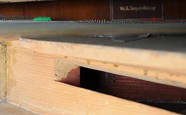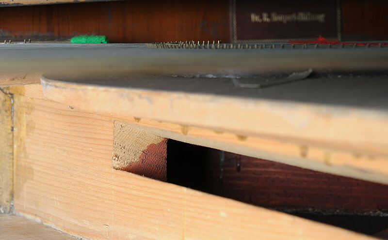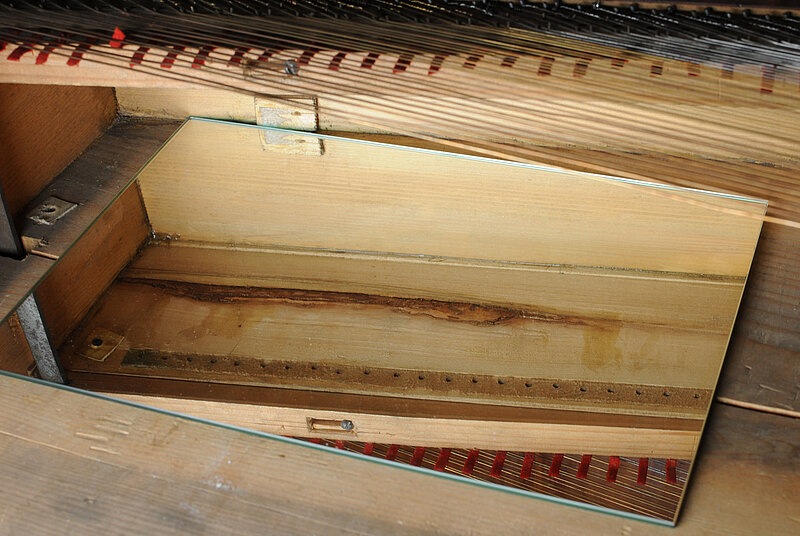 Züge: Kniehebel sowie dazugehörige Hebelei im Klaviaturraum und am Unterboden aus Eiche. Moderatorleiste aus Fichte mit Tuchstreifen (n.o.). Besaitung neu. 12 Saiten. 1-chörig, von F1 bis E1, 51 Saiten. 2-chörig, von F bis g3.