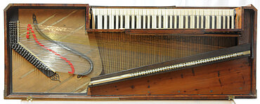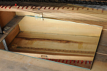 Tastenbelag: Untertasten u. Stirnkanten Knochen, Obertasten aus geb. Birnbaum mit Auflagen aus schwarz gebeiztem Birnbaum. In den Untertasten zwei rot eingefärbte Rillen. Tastenhebel aus Fichte mit Auflageböckchen