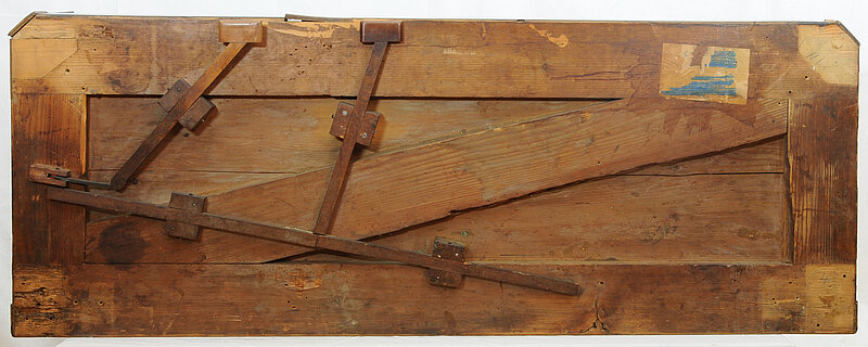 Resonanzboden aus Fichte mit nur an den Zargen entlang laufenden unprofilierten Leisten aus schwarz geb. Birnbaum, Stärke ca. 0,25 cm. Rippen aus Fichte(?). Steg aus schwarz geb. Birnbaum. S-förmig geschwungen. Beide Stegenden auslaufend mit Girlanden- und Rautenmotiven aus schwarz geb. Linde. Steghöhe vom Baß zum Diskant: 1,45–1,35 cm. Damm aus Fichte mit großem rechteckigen Fenster. Anhanghöhe im Baß und Diskant durchgehend:ca. 0,54 cm.