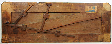 Deckel zweiteilig, aus Fichte. Eibe furniert, mit anschließender, an Scharnieren befestigter Frontabschlussklappe, ebenfalls Fichte. Eibe furniert. Am Deckel umlaufende. unprofilierte Leisten aus geb. Birnbaum. An der linken Zarge ein Deckelstützstab aus schwarz geb. Birnbaum (?). Zargen aus Fichte (?), innen und außen Eibe furniert. Die Rückwand aus Eiche. Alle auf den Unterboden aufgesetzt. Außer Rückwand umlaufender Sockel am unteren Zargenende aus Fichte (?), mit Eibe furniert, mit abschließender Leiste aus schwarz geb. Birnbaum. Zargenstärke: ca. 1,50 cm, Zargenhöhe mit Unterboden: 22,1 cm. Klavierbacken aus Birnbaumadern und je einer runden, gepressten und vergoldeten Messingplakette. Vorsatzbrett aus Fichte, Eibe furniert, mit Intarsien aus schwarz geb. Birnbaumadern und links und rechts von dem Signaturschild je eine Plakette wie Klavierbacken. Notenpult versenkbar, aus massiv Eibe, mit Intarsien aus schwarz geb. Birnbaumadern. Unterboden aus Fichte mit Verstärkungsstreben an den Rändern und diagonal verlaufend. Vier Beine aus Fichte, Eibe furniert, im Querschnitt 4-kantig. nach unten zu sich verjüngend. An den langen Kanten Streifen aus schwarz geb. Birnbaum. Fußklötze aus Rotbuche, n.o. (?).