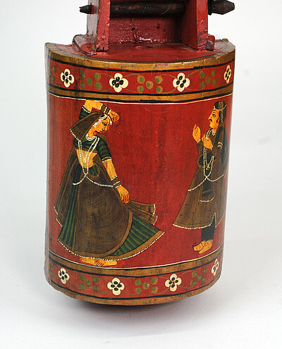 Rot lackiert mit Ornamenten und Figurendarstellungen auf der Rückseite
