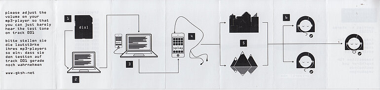 Booklet: Partitur (Informationsgrafik): sechsfach gefaltetes Druckerzeugnis (H 56 cm x 240 mm), erste Falz titelartig umfassend, der Rest nach Art eines Leporello. Design von Nico Bergmann.