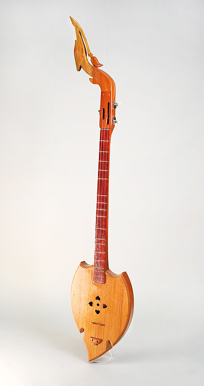 Vogelmotiv als Halsabschluss über dem Wirbelbrett