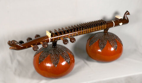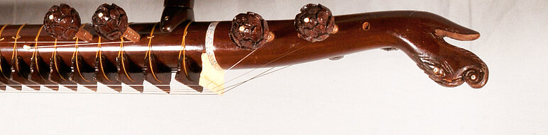 Tierdarstellungen an beiden Enden (Drachen- und Vogelkopf, vgl. die gestrichene Taus/Mayuri Vina)