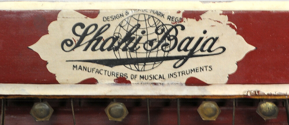 Herstellerschild auf der Klaviaturabdeckung: "DESIGN & TRADEMARK REG[istere]D. | Shahi Baja | MANUFACTURERS OF MUSICAL INSTRUMENTS"
