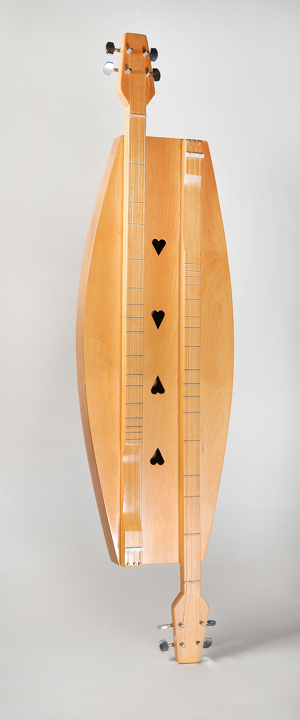 Double bzw. Courting Dulcimer mit zwei gegenüberliegenden Griffbrettern, die es ermöglichen, dass zwei einander gegenübersitzende Spieler auf einem Instrument musizieren.