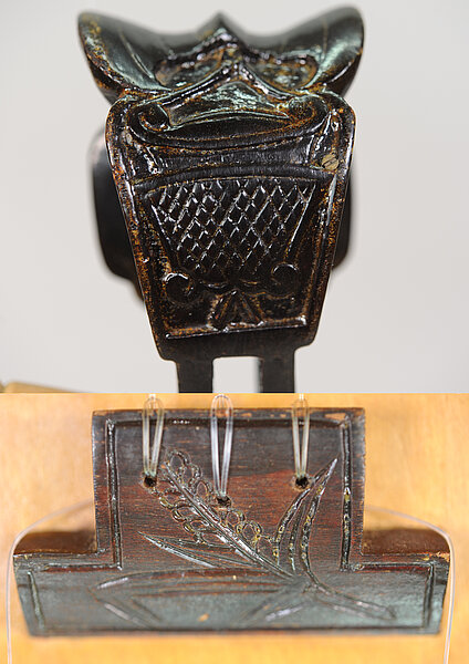 Schnitzwerk auf dem Kopf (Erntekorb) und auf dem Saitenhalter (Maiskolben)