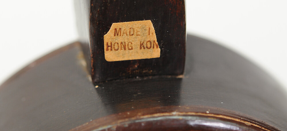 Auf dem Halsansatz hinten abgerissenes bestempeltes Etikett: "MADE I[N] | HONG KON[G]"