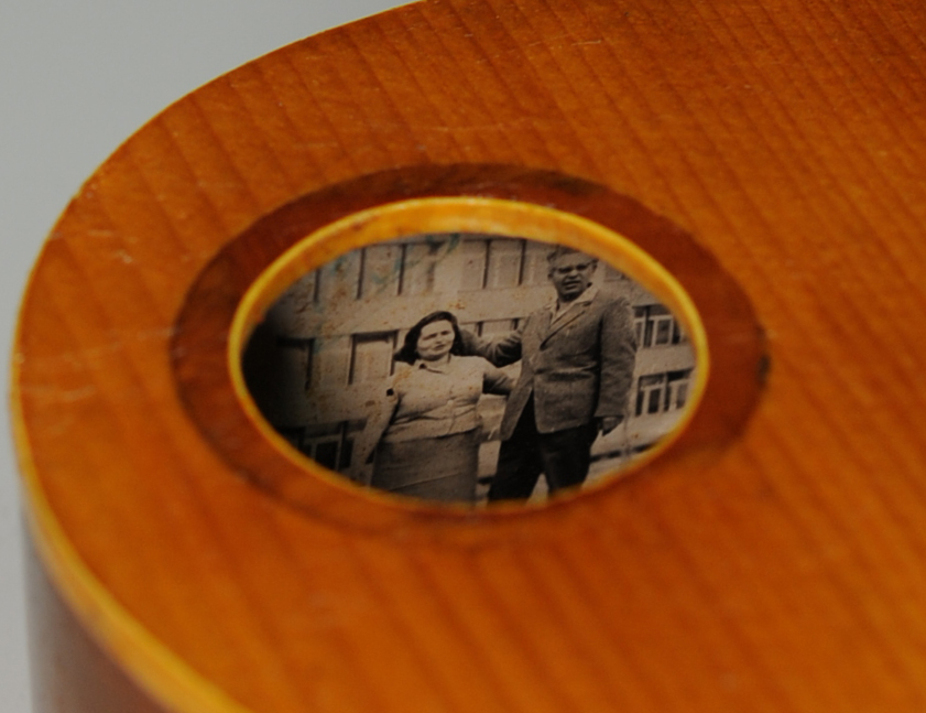 Bei kleinem Schallloch auf der inneren Verstärkung der Zarge aufgeklebtes Foto eines Paars