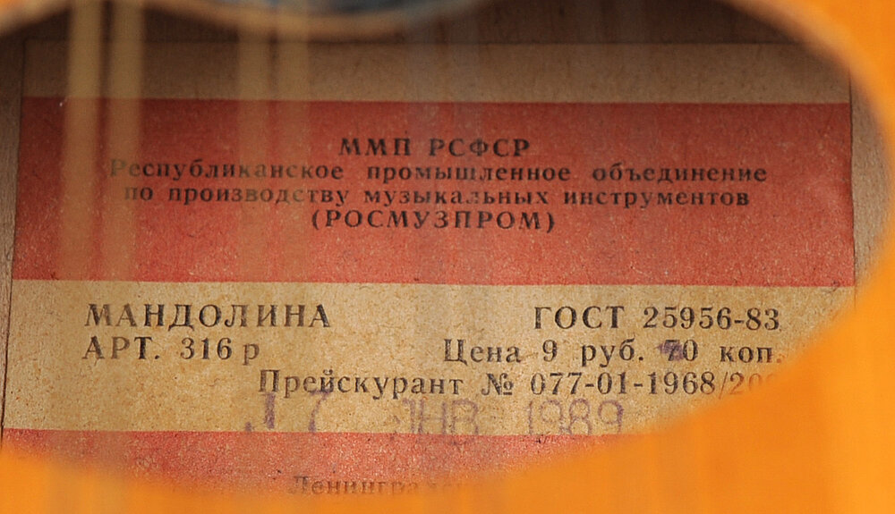 [MMP RSFSR | Republikanischer Industrieverband für die Herstellung von Musikinstrumenten (ROSMUZPROM) || MANDOLINE GOST [= Gossudarstwenny Standart, sowjetischer Industriestandard] 25956-83 | ART. 316 r Preis 9 Rubel 70 Kopeken. | Preisliste Nr. 077-01-1968/209 | [Stempel:] 17. Januar 1989 || Leningrader Produktion, | Kombinat für die Herstellung von Musikinstrumenten | 197061, Leningrad, 15 Chapaeva-Str. || 2873-22.5.85 Sosn. t. Leurizdat]
