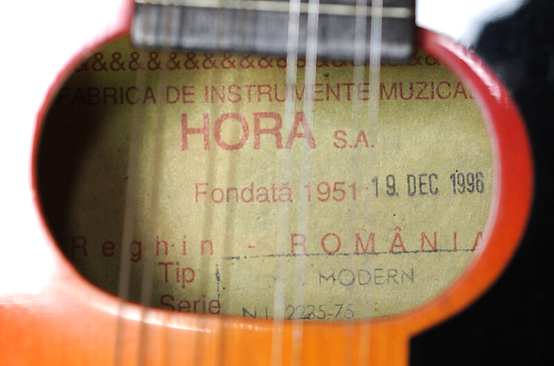 Zettel (mit einem Rahmen aus &-Zeichen): "FABRICA DE INSTRUMENTE MUZICALE | HORA S.A. | Fondată 1951 | [Stempel:] 19. DEC 1996 | Reghin – ROMÂNIA | Tip [Stempel:] MODERN | Serie [Stempel:] N.I. 2235-75 C.T.C."
