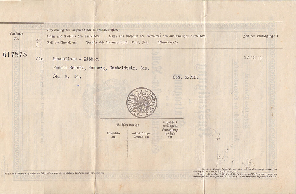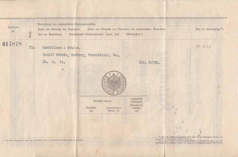 Über Rudolf Schatz – Humboldtstr. 34a, Hamburg (Barmbek) – ist bislang nichts bekannt. Am 24. April 1914 meldete er beim Kaiserlichen Patentamt eine „Mandolinen-Zither“ an. Am 17. Oktober 1914 wurde das Patent eingetragen und erhielt die Nummer 617878. Das dazugehörige Instrument liegt hier vor – in Serie ist es offenbar nicht gegangen. Die Verzierung auf der Decke ist so sorgfältig wie die des mit zwei Tuschefarben gestalteten Zettels.