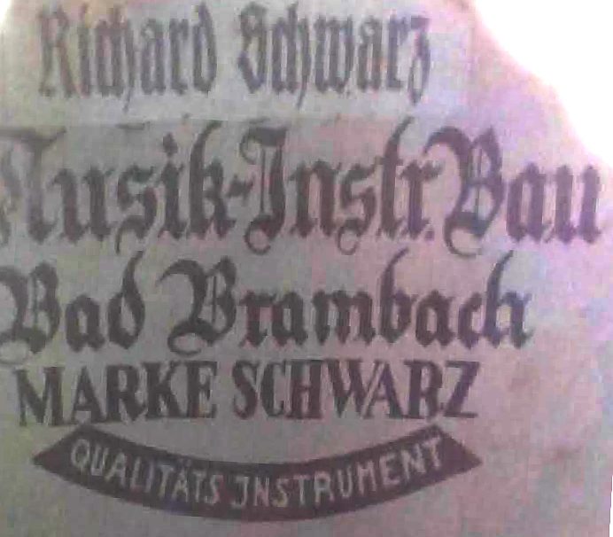 Zettel: "Richard Schwarz | Musik-Instr.Bau | Bad Brambach | MARKE SCHWARZ | QUALITÄTSINSTRUMENT"