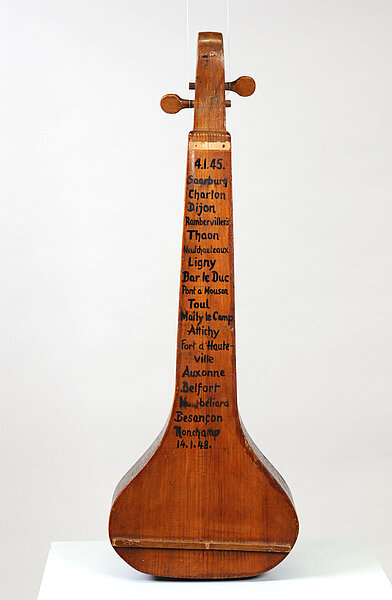 Dieses eigenartige Instrument hat einen Menschen drei Jahre lang auf der Resie begleitet. Es handelt es sich wohl um die selbstgebaute Zither eines deutschen Soldaten, der nach 1945 auf einem längeren Weg zurück nach Deutschland war. Auf dem Boden sind zwei Rahmendaten (1945/1948) notiert, dazwischen 18 Ortsnamen.