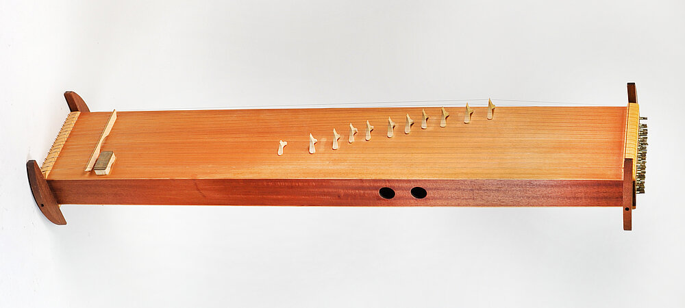 Koto (mit verschiebbaren Stegen): 12 Saiten (Stahl); die tiefste Saite ohne Steg, der erste Steg kleiner als die restlichen.