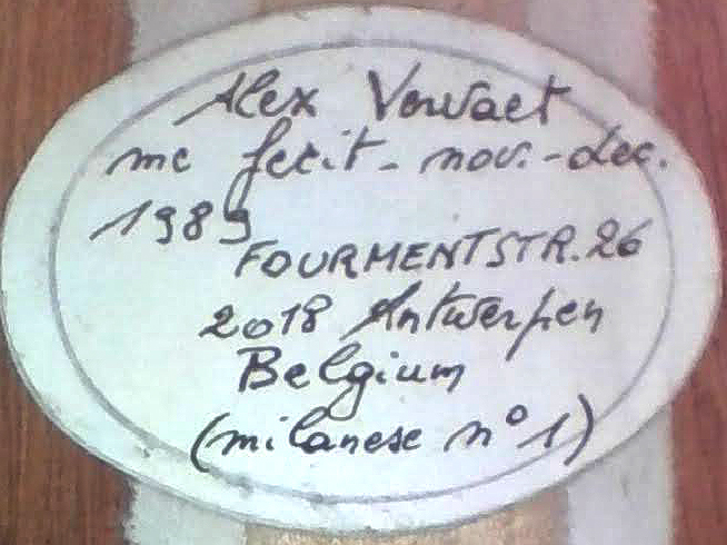 Zettel (hs.): "Alex Vervaet | me fecit. nov. – dec. | 1989 | FOURMENTSTR. 26 | 2018 Antwerpen | Belgium | (milanese n° 1)"