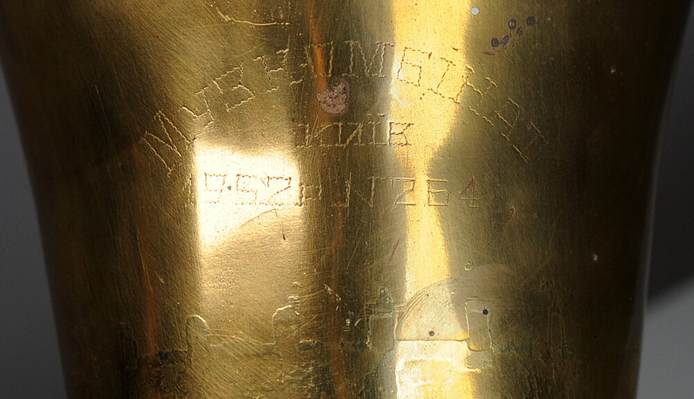 Hersteller (Gravur im Schallbecher über der Naht zum Stengel): "Музкомбінат | КИЇВ | 1952 р N261" [Muskombinat | Kiew | 1952 p N261]