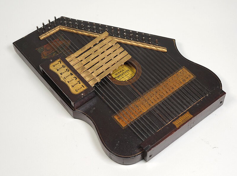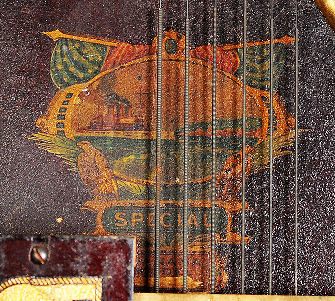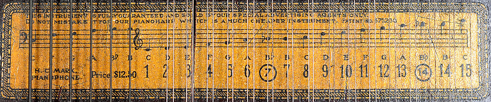 Auf der Stimmanweisung auf der Resonanzdecke unter den Saiten, oben: "THIS ISNTRUMENT IS FULLY GUARANTEED AND SOLD BY OUR SPECIAL ADVERTISING AGENTS ONLY. | DO NOT MISTAKE IT FOR OUR PIANOHARP WHICH IS A MUCH CHEAPER INSTRUMENT. PATENT No. 675230". Unten links: "H. C. MARX. | PIANOPHONE | Price. $12.50"