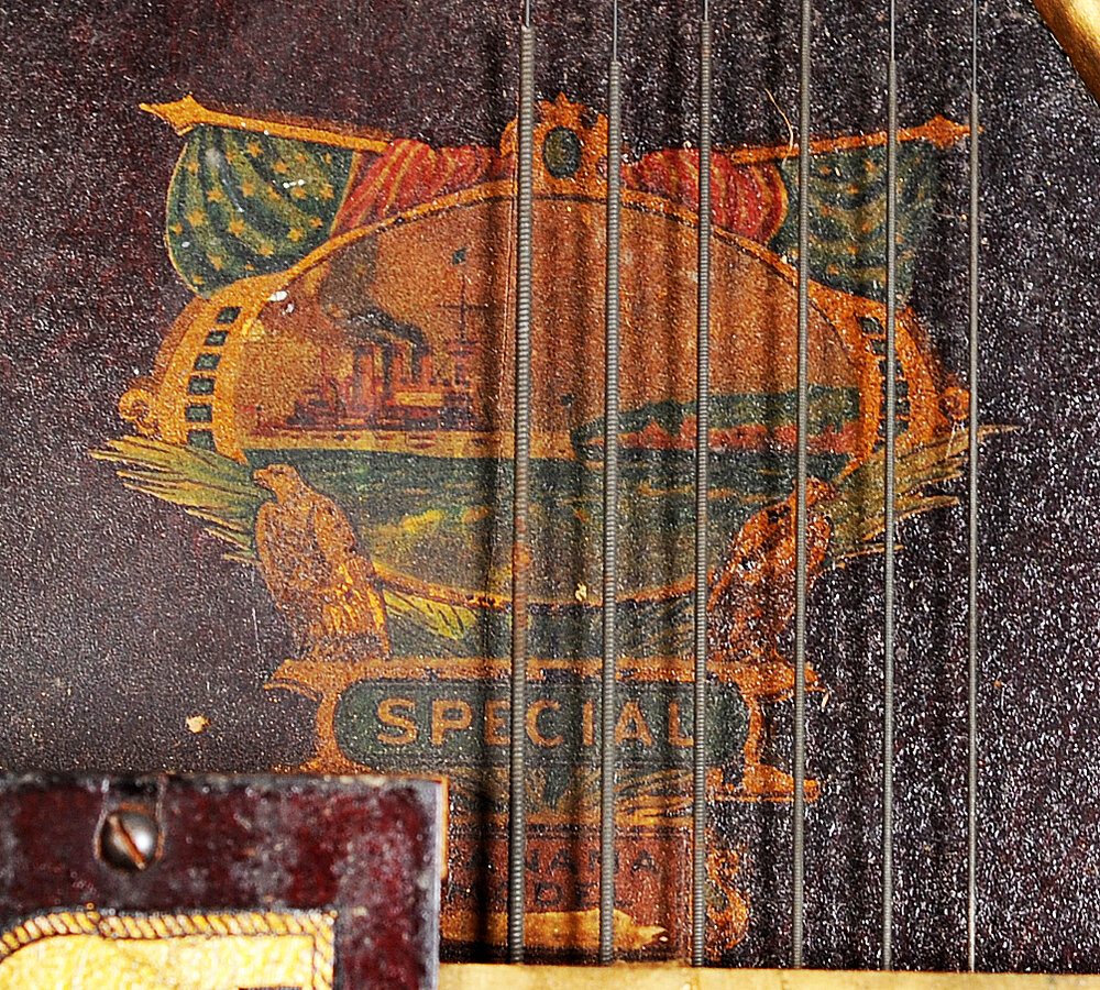 Zettel unter dem Schallloch: "MARX | Pianophone | Hand-Made Instrument | Sold through our Advertising Agents | FOR AGENCY – WRITE TO | MARX & MARX | 227 S. Wood St., CHICAGO, ILL. | New Music and Strings"